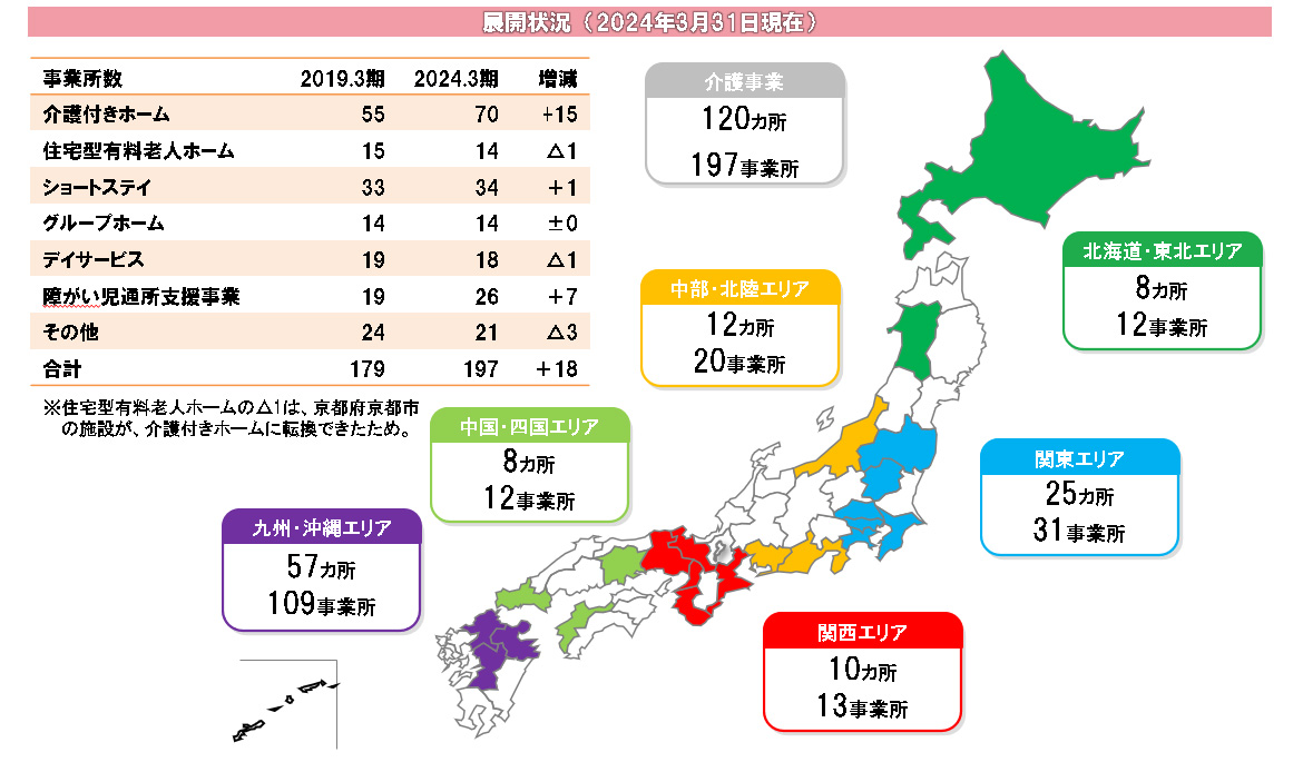 介護事業では、「さわやか倶楽部」として、介護付有料老人ホームを中心に、住宅型有料老人ホーム、ショートステイ、グループホーム、デイサービス、障がい児通所支援事業などの各施設を全国に展開しています。