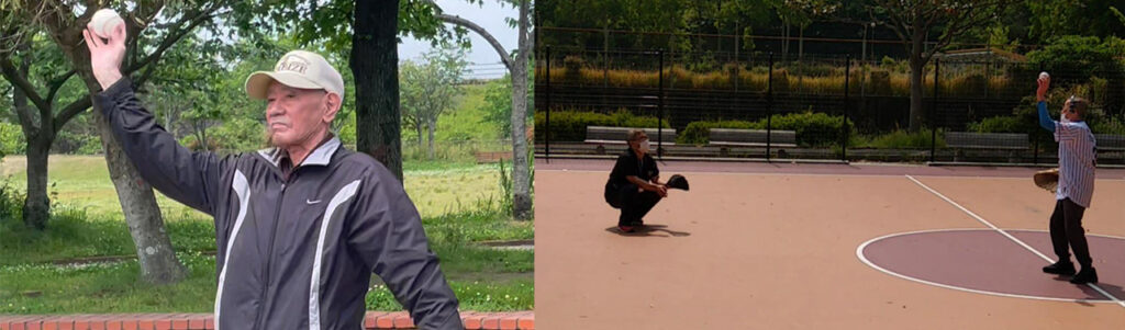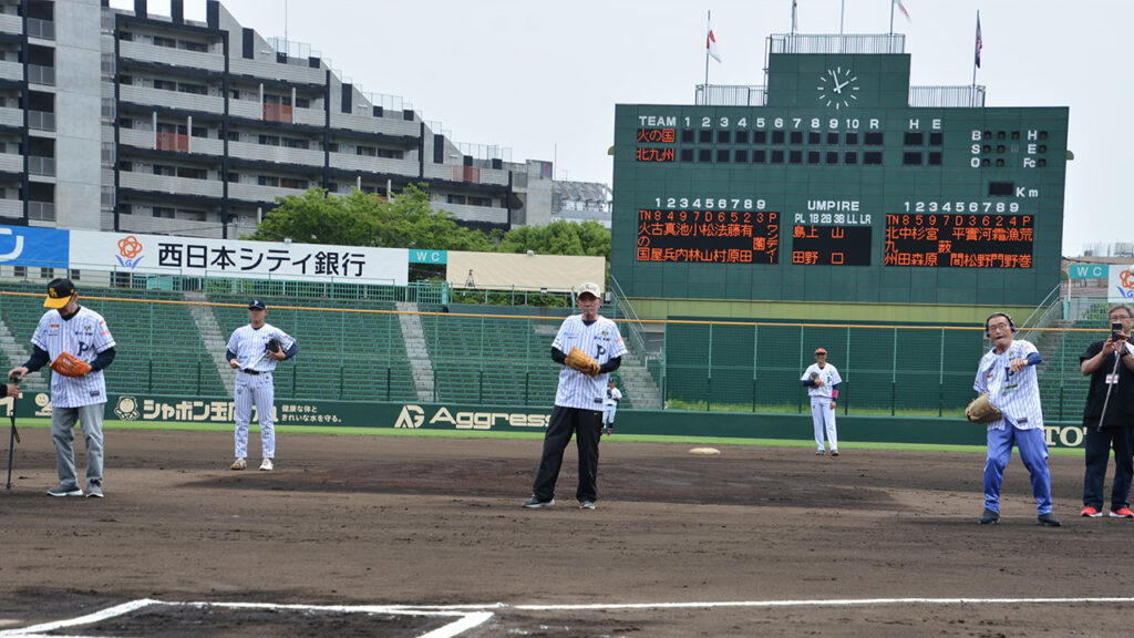 始球式を務められたのは、「さわやか新門司館」の片岡覚之介様(86歳)、「さわやか和布刈館」の泊義様(85歳)、「さわやか花美館」の中村誠治様(75歳)の3名。皆様、日ごろから野球が大好きで、この特別な機会に向けて事前にピッチング練習を重ね、本番に備えて準備を進めてこられました。