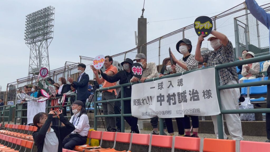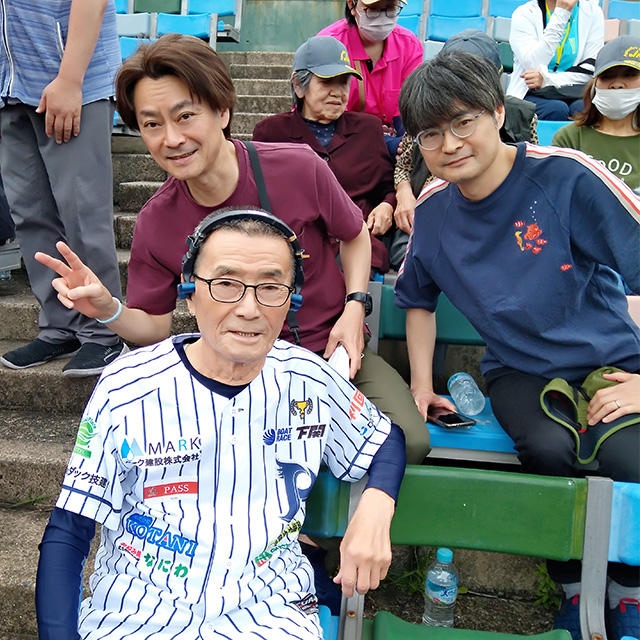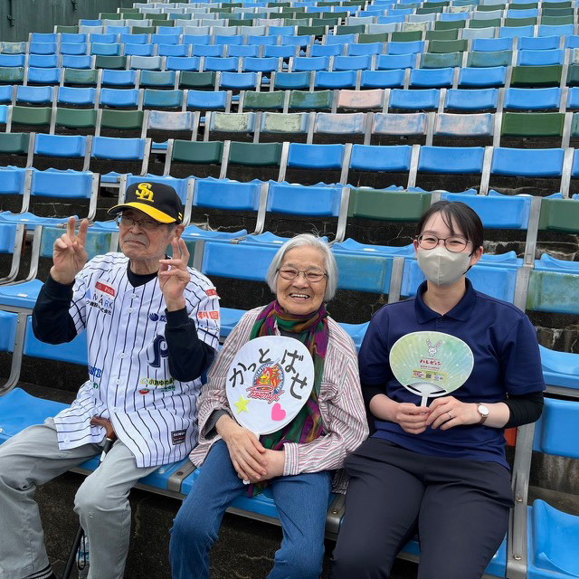 当日は近隣の介護施設からもご入居者様約80名、職員約20名の合計100名ほどが球場に駆けつけ、それぞれの施設で心を込めて作成した応援グッズを手に、温かい声援を送りました。