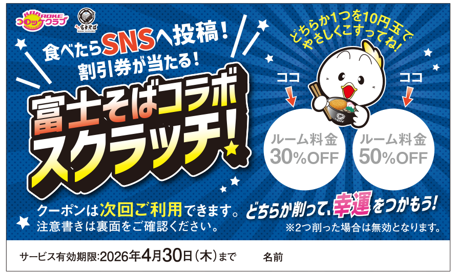 コラボメニューを注文し、ハッシュタグ「#コロッケ倶楽部で富士そば」をつけてSNS(X,Instagram,TikTokなど)に投稿。お会計時に画面を提示いただくと、その場でスクラッチカードを進呈します。
