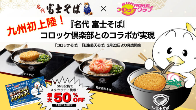 ウチヤマグループの「カラオケコロッケ倶楽部」および「居酒屋かんてきや」は、関東エリアで絶大な支持を集める立ち食いそばチェーン「名代 富士そば」とコラボレーションし、2026年3月20日(金)より人気メニュー「コロッケそば」「紅生姜天そば」を期間限定で提供開始いたします。