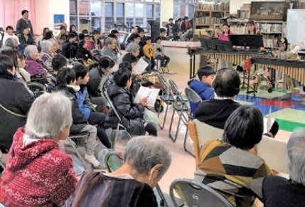 さわやか愛の家あだち館が主催するふれあいコンサートを近隣の特別養護老人ホームのフロアにて開催。入居者様、愛の家に通う子供たち、地域の方々や本社の社員も集い、アンサンブルグループ「マリンパフォルテジュニアズ」の演奏を楽しく鑑賞し、交流を行いました。