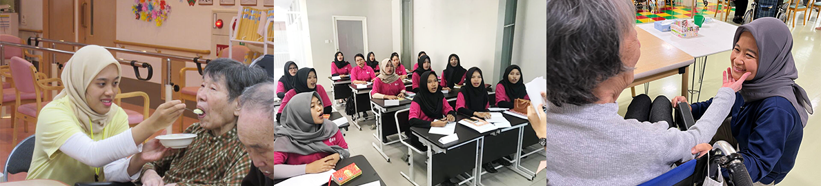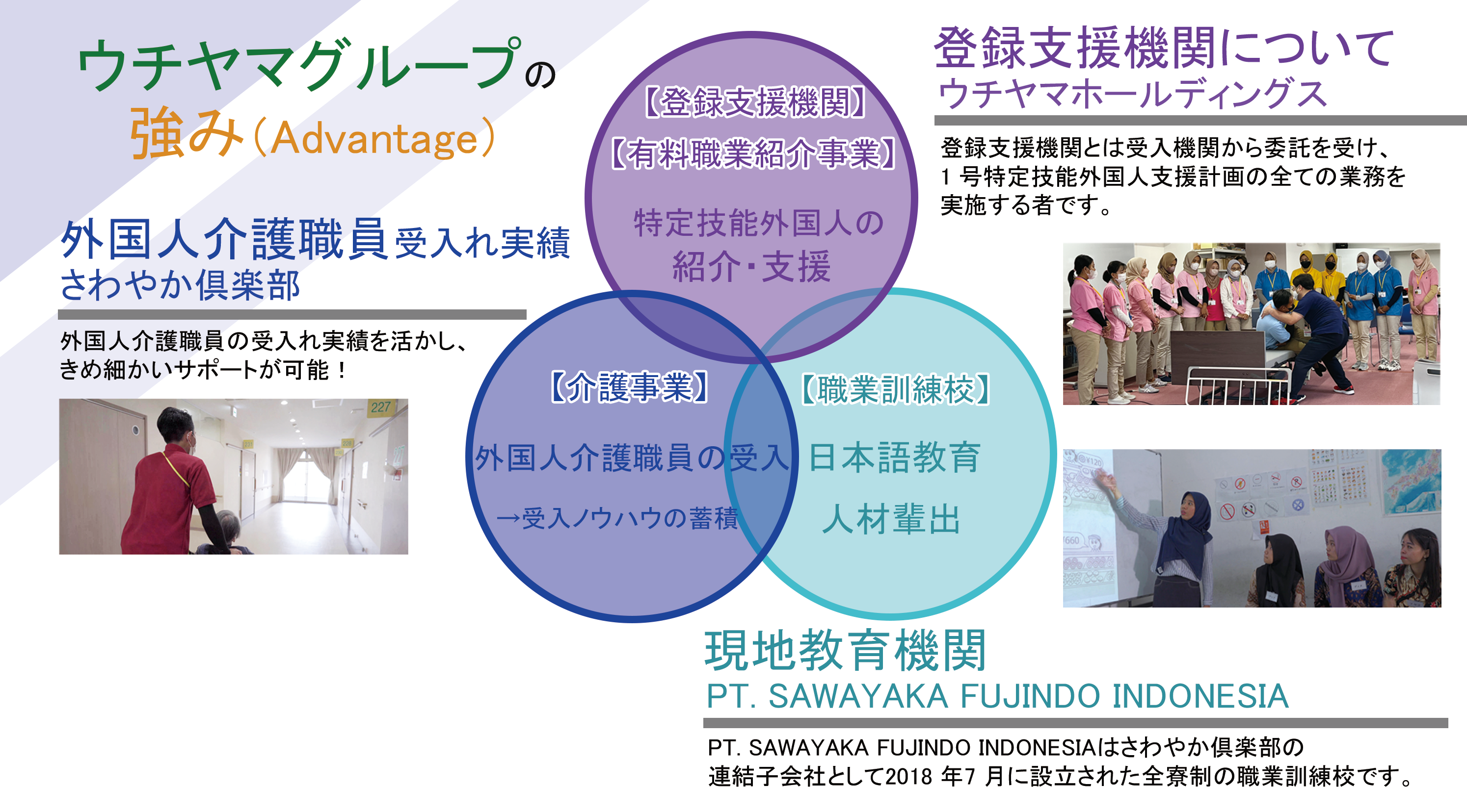 ウチヤマグループは、インドネシア現地に日本語を教える「教育機関」を持ち、そこで日本語を学んだインドネシア人職員を「自社介護施設」で受入れてきたノウハウを活かして、現在では「登録支援機関」として特定技能外国人の受入れに関する支援も行っております。