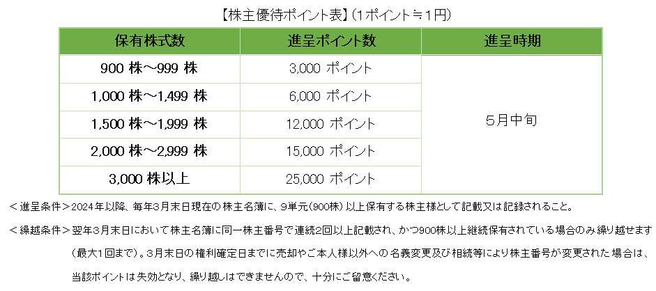 2024年以降、毎年3月末日現在の株主名簿に記載または記録された9単元(900株)以上保有の株主様を対象に、下表の通り保有株式数に応じて株主優待ポイントを進呈いたします。