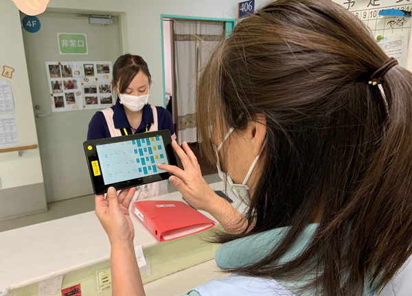 実験データの分析の結果、介護職員の一日の業務のうち、特に記録に関する業務に多くの時間を割かれていることが判明しました。そこで、九州工業大学の井上創造教授の主導のもと、協同で開発を行ったスマートフォン用の介護記録アプリ「FonLog」を導入することで、記録業務に関わる時間の約4割を削減することに成功しました。